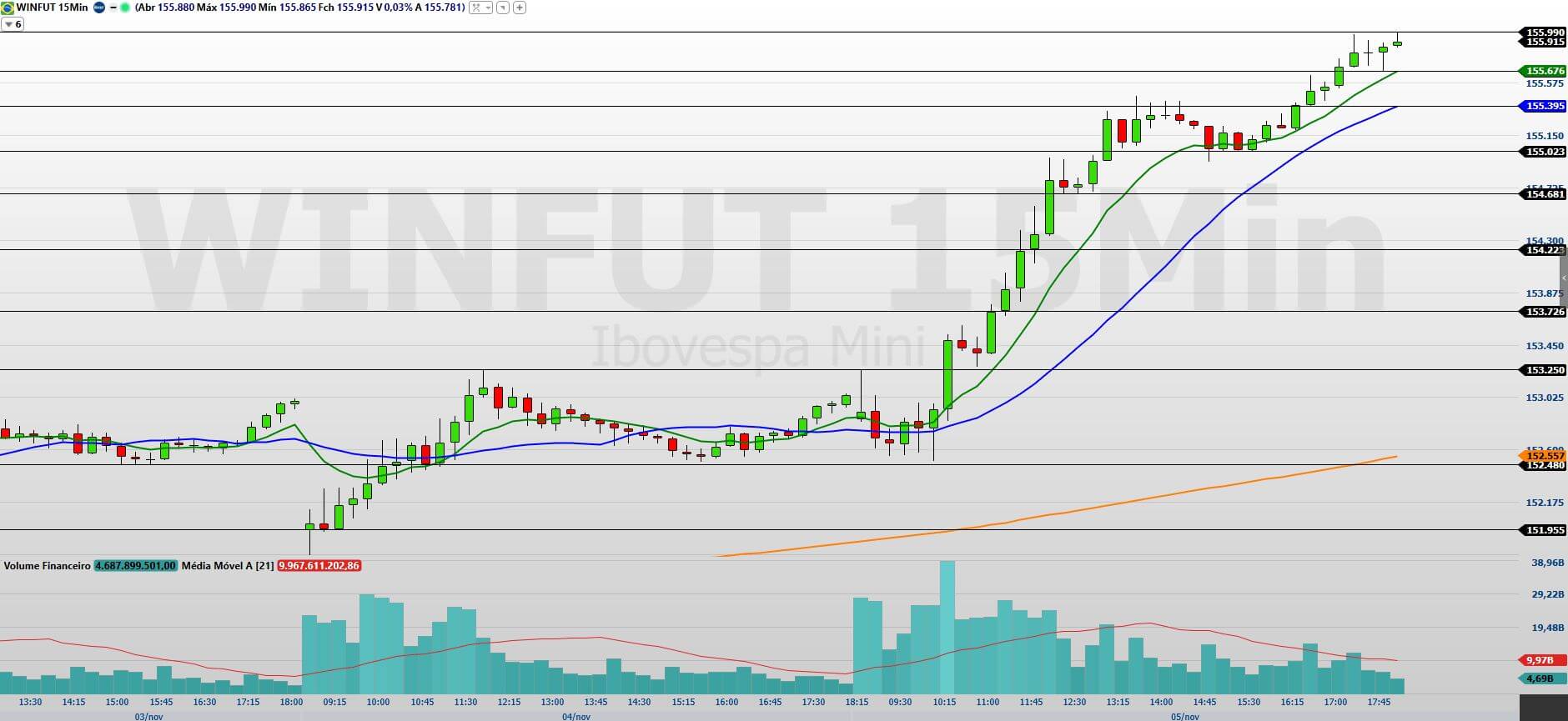 Os contratos de mini-índice WINZ25, com vencimento em dezembro, encerraram a sessão de 05/11 em alta de 1,84%, aos 155.915 pontos.